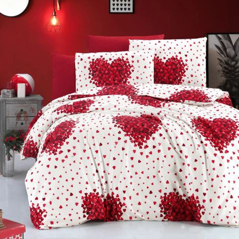 Lenjerie de pat dublu Bumbac Ranforce 4 piese cearsaf pat 240 x 260 cm, pilota 200x230 cm, 2 fete perne 50x70 cm, Inimioare, Alb / Rosu, Pucioasa