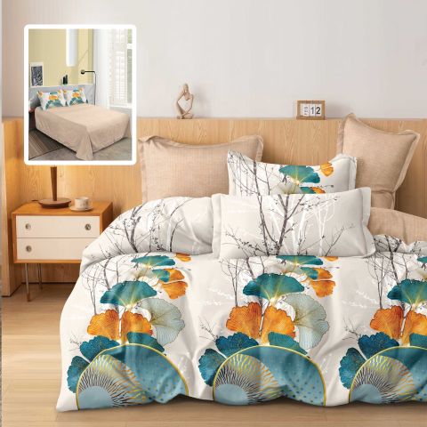 Lenjerie de pat dublu bumbac Finet 6 piese 220 x 240 cm, pilota 200x220 cm, 2 fete perna 50x70 si 70x70 cm, Bej / Verde, Pucioasa TARA V1