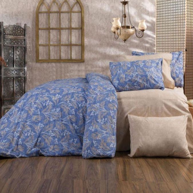 Lenjerie de pat dublu Bumbac Ranforce 4 piese cearsaf pat 240 x 260 cm, pilota 200x230 cm, 2 fete perne 50x70 cm, Albastru-Bej, Ralex Pucioasa