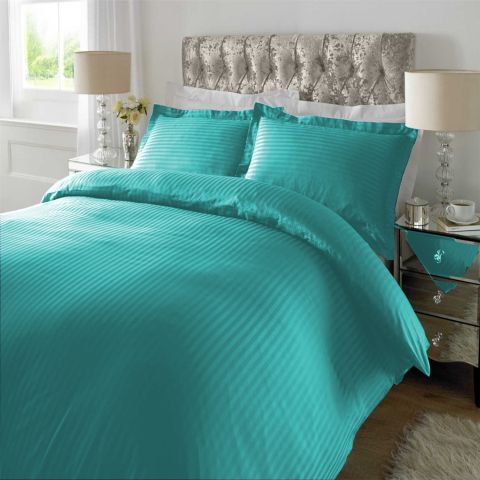Lenjerie de pat dublu king size Damasc Policoton dunga 1 cm, 4 piese, cearsaf pat 230x260 cm, cearsaf pilota 200x230 cm, 2 fete perna 50x70 cm Turcoaz Deschis