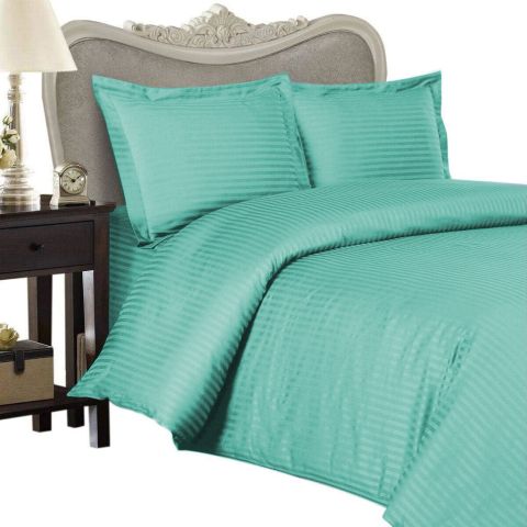 Lenjerie de pat o persoana Damasc Policoton dunga 1 cm, 3 piese, cearsaf pat 160x230 cm, cearsaf pilota 140x220 cm, fata perna 50x70 cm Turcoaz Deschis