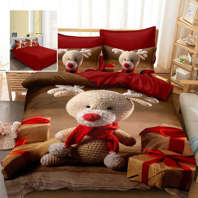 Oferă magia sărbătorilor dormitorului tău cu acest minunat set de lenjerie din bumbac Finet 6 piese cu imprimeuri deosebite tridimensionale 3D cu motive de Crăciun.