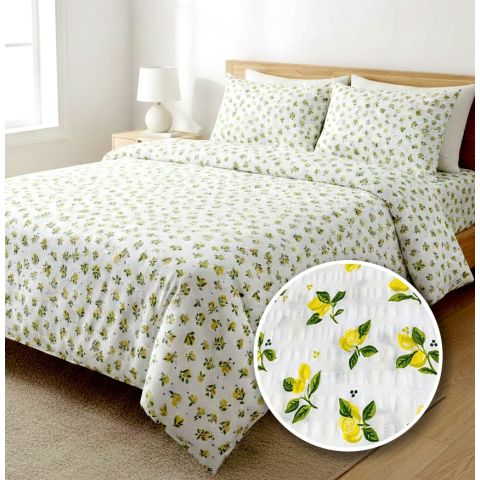Lenjerie pat Creponata 100% Bumbac, cearsaf pat 160x240 cm, pilota 140x210 cm, fata perna 50x70 cm, Alb/Galben, Pucioasa CREP59
