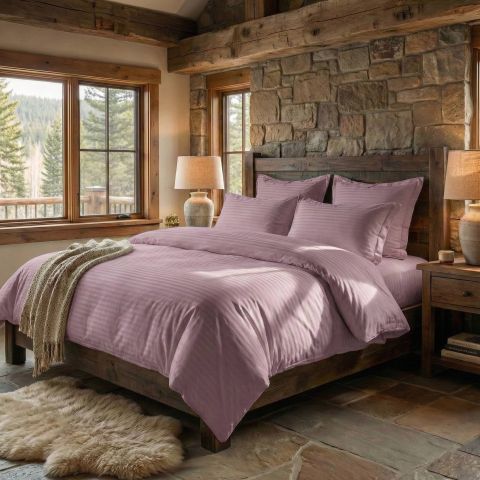 Lenjerie pat dublu 6 piese Damasc Policoton, cearsaf pat 230x250 cm, pilota 200x230 cm, fete perne 50x70 cm si 70x70 cm, dunga 1 cm Lila