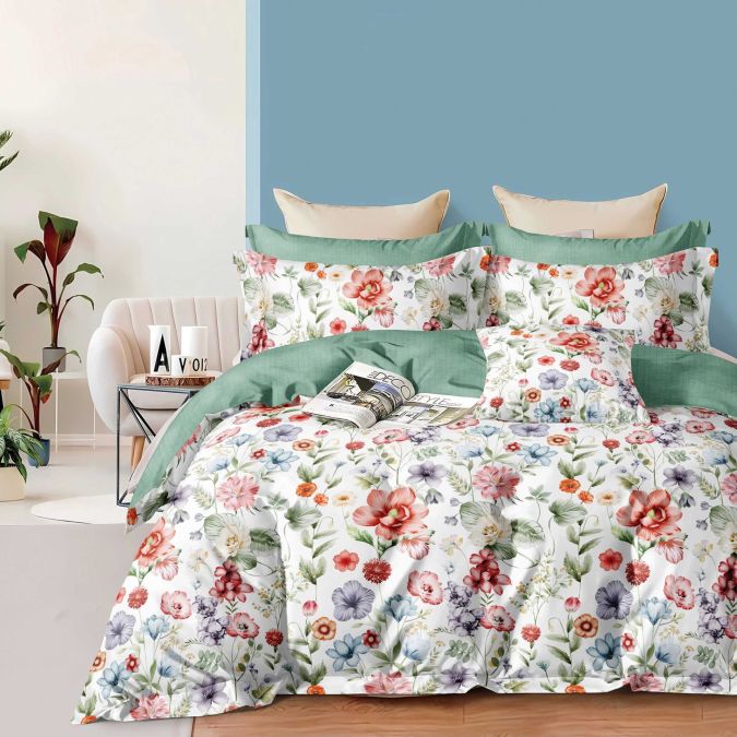 Lenjerie pat dublu Economy 4 piese, cearsaf pat 230x250 cm si pilota 200x230 cm, 2 fete perne 50x70, Floricele colorate Verde ECN2 Ralex Pucioasa