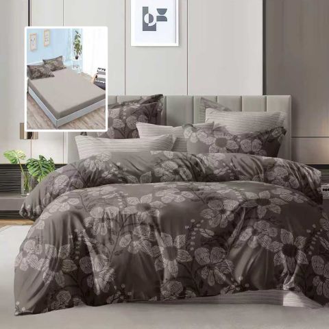 Lenjerie pat dublu Economy 6 piese, cearsaf pat cu husa 180x200 cm si pilota 200x230 cm, 2 fete perne 50x70 si 2 fete perna 70x70, Flori Bej/Maro ECNH32