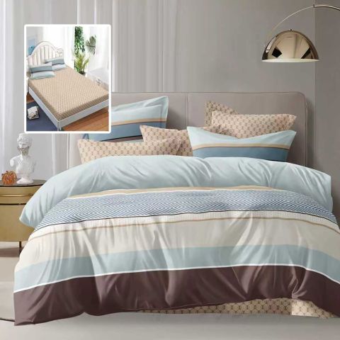 Lenjerie pat dublu Economy 6 piese, cearsaf pat cu husa 180x200 cm si pilota 200x230 cm, 2 fete perne 50x70 si 2 fete perna 70x70, Moderna Cappuccino/Bleu ECNH26
