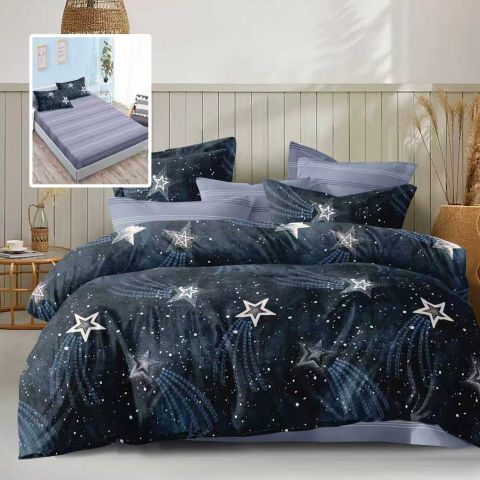 Lenjerie pat dublu Economy 6 piese, cearsaf pat cu husa 180x200 cm si pilota 200x230 cm, 2 fete perne 50x70 si 2 fete perna 70x70, Peisaj Nocturn AlbastruECNH39