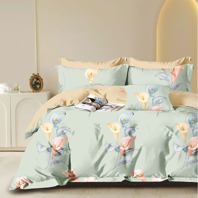 Lenjerie pat dublu extra large Percalle imprimat Bumbac 100%, 6 piese, cearsaf pat 240x260 cm, pilota 200x230 cm, 2 fete perna 50x70 cm si 70x70 cm, Cale Galben / Verde, Pucioasa