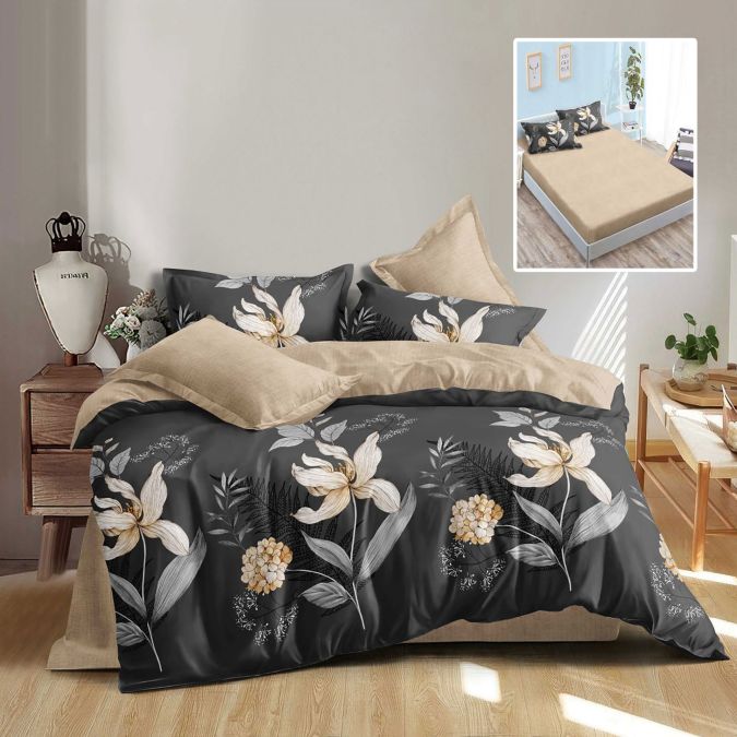 Lenjerie pat dublu Finet Bumbac 6 piese cu husa saltea 160x200 sau 180x200 cm, pilota 200x230 cm, 2 fete perna 50x70 si 70x70 cm, Bej-Negru, ELLA Ralex Pucioasa