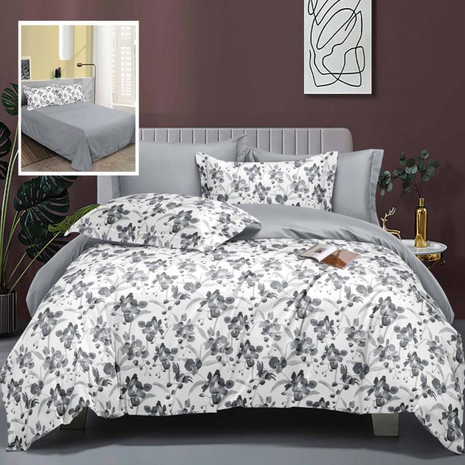 Lenjerie pat dublu Finet Bumbac Elegance 6 piese cearsaf pat 230x250 cm, cearsaf pilota 200x230 cm, 2 fete perna 70x70 cm, 2 fete perna 50x70 cm, Imprimeu floral Gri, Ralex Pucioasa