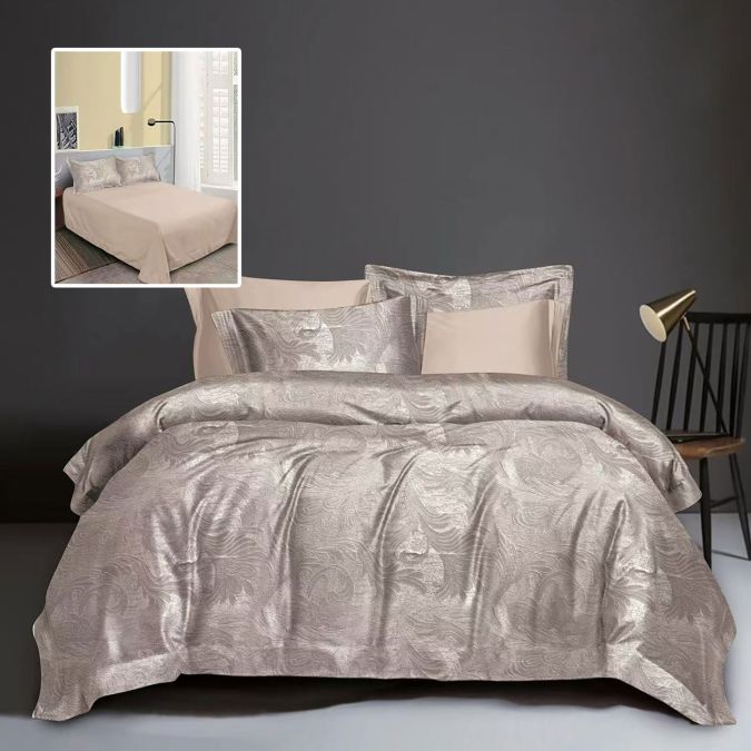 Lenjerie pat dublu Jacquard 6 piese, cearșaf pat 230x250 cm, pilotă 200x230 cm, 2 fețe perne 50x70 și 70x70 cm, Clasy, Roz Pudră/Bej