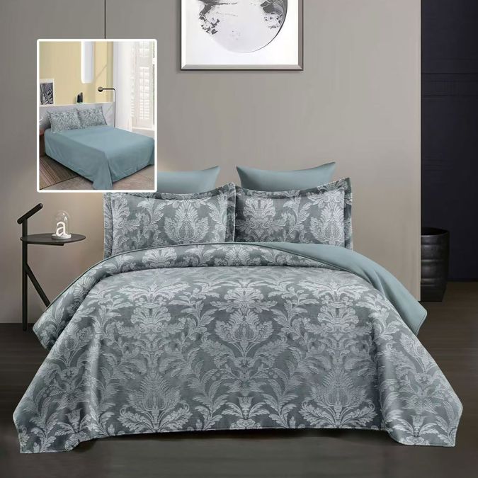Lenjerie pat dublu Jacquard 6 piese, cearșaf pat 230x250 cm, pilotă 200x230 cm, 2 fețe perne 50x70 și 70x70 cm, Clasy, Bleu