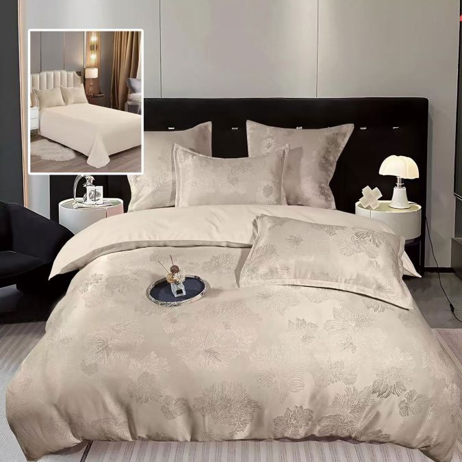 Lenjerie pat dublu Jacquard 6 piese, cearșaf pat 230x250 cm, pilotă 200x230 cm, 2 fețe perne 50x70 și 70x70 cm, Clasy, Crem