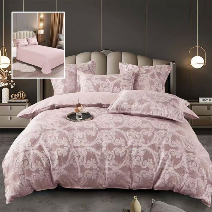 Lenjerie pat dublu Jacquard 6 piese, cearșaf pat 230x250 cm, pilotă 200x230 cm, 2 fețe perne 50x70 și 70x70 cm, Clasy, Roz