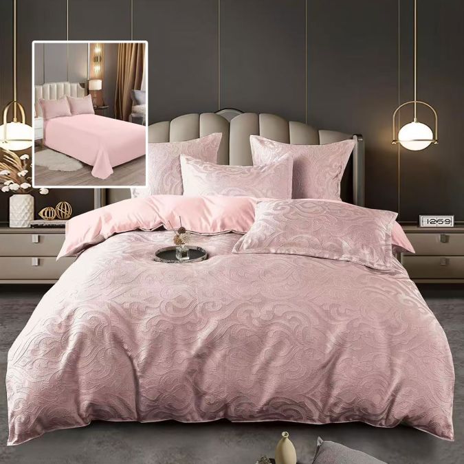 Lenjerie pat dublu Jacquard 6 piese, cearșaf pat 230x250 cm, pilotă 200x230 cm, 2 fețe perne 50x70 și 70x70 cm, Clasy, Roz V1