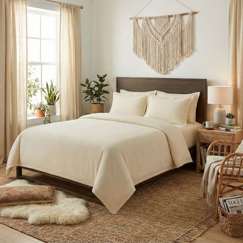 Lenjerie pat Ranforce Bumbac 100% UNI 4 piese, cearșaf pat 240x260 cm, pilotă 200x220 cm, 2 fețe perne 50x70 cm, Bej, Pucioasa
