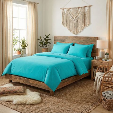 Lenjerie pat Ranforce Bumbac 100% UNI 4 piese, cearșaf pat 240x260 cm, pilotă 200x220 cm, 2 fețe perne 50x70 cm, Turcoaz, Pucioasa