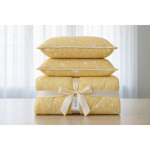 Pachet PROMO Primăvară Pilotă 180x200 cm + 2 perne 50x70 cm, model Lună și Stele, GalbenPreț Promo 119,00 Lei Preț listă 179,00 Lei